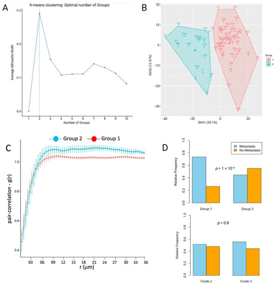 Silhouette width analysis for various K-means aggregations of patients, obtained by clustering the PCF values, showed that the optimal number of groups was n = 2 (Figure 3A). This separation into two groups was in agreement with the principal component analysis (PCA) plot that showed two clear segregation of PCF values when reduced to two dimensions (Figure 3B). Figure 3C shows the PCF as a function of the radii r with the corresponding error bars. The closer PCF values are to 1—over a range of radii—the greater the propensity for spatial randomness. Therefore, as indicated by the error bars in Figure 3C, Group 1 exhibited more spatial randomness compared to Group 2, at r > 8 µm. Notably, spatial Group 1 also showed significantly greater association with clinical metastasis compared with spatial Group 2 (p < 0.01), whereas histologic ISUP/WHO grade showed no association with metastatic status (p = 0.79, Figure 3D). Supplementary Table S2 lists the patient identification numbers and the spatial group to which they belong.
