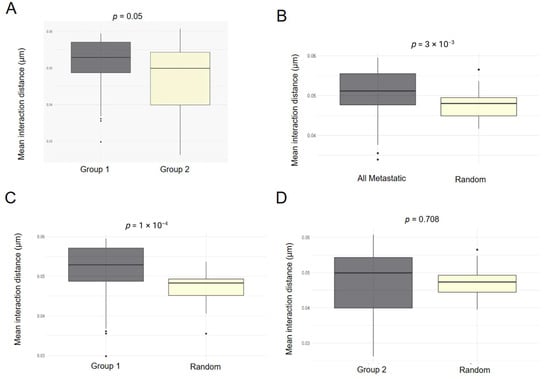 A critical output parameter for the optimal fits in GSP is the interaction radius r. While PCF gives the normalized probability that a certain distance separates two cells, the interaction distance parameter for the GSP gives the actual distance of interaction between the cells, and therefore we can compare this to the PCF, as both are local measures. Consistent with the PCF analysis, the mean interaction distances between tumor cells in Group 1 patients were significantly higher than those in Group 2 patients (Figure 4A). The mean interaction distances between tumor cells in all patients with metastatic disease and in Group 1 patients were greater than the intercellular distance among simulated random cells (Figure 4B,C). Interestingly, the mean interaction distances between tumor cells in Group 2 patients did not differ significantly from those in random cells (Figure 4D). These results suggest a high degree of tension between the cells in the Group 1 patients as well as those with aggressive, metastatic disease, potentially resulting in the loss of cell adhesion and an eventual metastatic cascade.