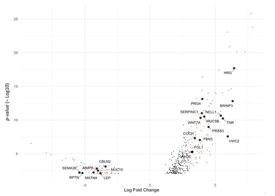 Fold change versus p-value for differentially expressed genes between Group 1 and Group 2 patients (adjusted p-value cutoff false discovery rate < 0.01). Also highlighted are the matrisomal genes with fold change greater than 3.