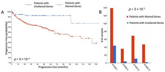 (A) Progression-free survival in a multi-institutional TCGA cohort of ccRCC patients with altered and unaltered genes. (B) Disease stage segregation of samples with altered and unaltered genes.
