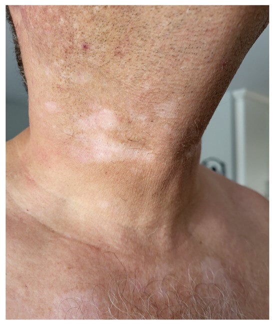 Figure 3. Vitiligo of the neck and chest in a patient receiving ipilimumab and nivolumab.