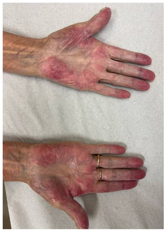 | Palmoplantar erythrodysesthesia (PPE)/hand-foot syndrome (HFS)/acral erythema | Culprits: TKI: sunitinib, pazopanib, cabozantinib, lenvatinib, erdafitinib, tivozanib, axitinib. mTOR-inhibitor: everolimus. Features: Onset: days to weeks [12,37]. Presentation: symmetric, erythematous, edematous, and tender lesions that may progress to blistering with desquamation, erosion, and ulceration; affects areas of friction, pressure, and other mechanical stress; pressure points on palms and soles, interweb spaces, lateral feet, elbows and extensor surfaces, amputated limb stumps [12,13]. Initial workup: Directed by patient presentation. Dermatology referral: As needed. Initial management: Mild to moderate: identify culprit drug; may treat symptomatically through course if necessary; topical keratolytics (e.g., containing salicylic acid, urea, etc.; high-potency topical corticosteroids (e.g., betamethasone valerate, clobetasol dipropionate, etc.); consider: oral vitamin E, vitamin B6; supportive care, such as emollients, pain management, wound care, dressings; preventative measures, such as patient information, avoidance of mechanical stress/friction/pressure/heat, regular emollient use, reducing sweat. Severe: identify and discontinue culprit drug; systemic corticosteroids (~1 mg/kg/day with gradual taper) [12,13,37]. Prognosis: Resolution: ~1–2 weeks following drug discontinuation [12,13]. |