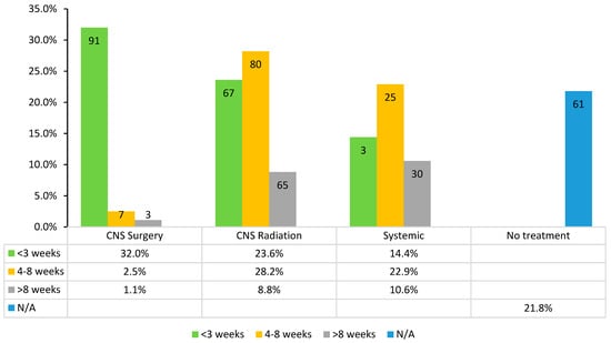 Of the 284 cases included in the study, 223 (78.5%) received anti-cancer treatment after diagnosis with brain metastases. A total of 136 cases (47.9%) received systemic treatment: 14.4% received their initial treatment within 3 weeks of brain metastases diagnosis, 22.9% received their initial treatment from 4 to 8 weeks after diagnosis, and 10.6% received treatment beyond 8 weeks after diagnosis. A total of 101 cases (35.6%) received CNS-specific surgical treatment after brain metastases diagnosis: 32.0% had surgery within 3 weeks, 2.5% had surgery from 4 to 8 weeks after diagnosis, and 1.1% had surgery beyond 8 weeks after diagnosis (Figure 1).