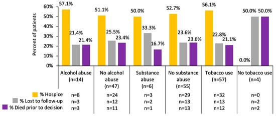 Outcomes of cases who received no treatment (n = 61) by social history (the number of cases is shown inside the bars; alcohol abuse p = 0.999, substance abuse p = 0.864, tobacco use p = 0.042).