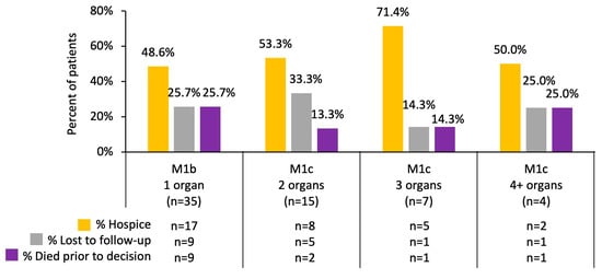 Of the 61 cases that received no treatment, 35 (57.4%) were labeled as M1b with one organ site involvement outside the lung/chest cavity (48.6% went to hospice, 25.7% were lost to follow-up, and 25.7% died before any treatment or the option of going to hospice), 15 (24.6%) cases were labeled as M1c with two organ site involvements outside the lung/chest cavity (53.3% went to hospice, 33.3% were lost to follow-up, and 13.3% died before any treatment or the option of going to hospice), 7 (11.5%) cases were labeled as M1c with three organ site involvements (71.4% went to hospice, 14.3% were lost to follow-up, and 14.3% died before any treatment or the option of going to hospice), and 4 (6.6%) cases were labeled as M1c with four or more organ site involvements (50.0% went to hospice, 25.0% were lost to follow-up, and 25.0% died before any treatment or the option of going to hospice) (Figure 3).