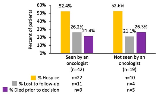 Outcomes of cases who received no treatment (n = 61) by an oncologist (the number of cases is shown inside the bars). About half of the patients in both groups entered hospice, while the remaining half were fairly evenly split between those lost to follow-up and those who died before a treatment decision was made.