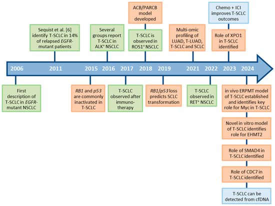 Timeline of discoveries related to SCLC transformation. Green boxes indicate observations in patients. Orange boxes indicate the development of new experimental model systems and mechanistic discoveries. Blue boxes indicate discoveries related to diagnosis and treatment of patients. T-SCLC: transformed small cell lung cancer; NSCLC: non-small cell lung cancer; LUAD: lung adenocarcinoma; ICI: immune checkpoint inhibitor; cfDNA: cell-free DNA.