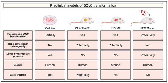 Experimental models of small cell lung cancer (SCLC) transformation. Comparison of experimental models of SCLC transformation indicating whether each model recapitulates SCLC evolution/transformation, tumor heterogeneity and selection driven by therapeutic pressure. Information is also provided on the species of each model and whether they represent an easily tractable system. PARCB/ACB: genetically engineered human xenograft model using manipulations in p53, AKT, RB1, c-MYC and BCL2. ERPMT: genetically engineered mouse model possessing transgenes for EGFRL858R, MycT58A and tdTomato and floxed alleles of p53 and Rb1. PDX: patient-derived xenograft.