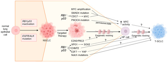Lung cancer is broadly classified into two main histological subtypes, termed small cell lung cancer (SCLC, ~15% of cases) and non-small cell lung cancer (NSCLC, ~85% of cases) [1,2]. SCLC is described as a neuroendocrine (NE) cancer of the lung, whereas NSCLC is primarily of epithelial origin and is further divided into three main subtypes: adenocarcinoma (LUAD), squamous cell carcinoma and large cell carcinoma [2,3]. Various oncogenic driver mutations have been identified in NSCLC, with some of the most common being activating mutations in epidermal growth factor receptor (EGFR) and fusion proteins involving anaplastic lymphoma kinase (ALK) [2,3]. The discovery of these key oncogenic drivers has spurred the development of various targeted therapies, such as tyrosine kinase inhibitors (TKIs), which have provided significant survival benefits compared to traditional chemotherapy [4]. Unfortunately, the majority of tumors eventually develop resistance to these therapies through a variety of mechanisms [4]. One such mechanism is histological transformation of the initial NSCLC into SCLC, a process termed SCLC transformation (also referred to as small cell transformation or NE transformation) [5]. In these cases, relapsed tumors undergo significant molecular and histological changes and exhibit many classical characteristics of SCLC, such as high nuclear-to-cytoplasmic ratio, expression of NE markers and inactivation of the RB1 and p53 tumor suppressors [6,7,8]. Importantly, the transformed SCLC tumors retain the initial oncogenic mutation found in the original NSCLC, highlighting the likelihood of direct evolution of the initial NSCLC [6,7,8]. We refer to these instances of NSCLC-to-SCLC transformation as transformed SCLC, or T-SCLC, to distinguish them from SCLC that arises de novo. Unfortunately, there are few treatment options for patients with T-SCLC, which results in very poor outcomes for these patients [9,10,11,12]. Developing a better understanding of the mechanisms that drive NSCLC-to-SCLC transformation will ultimately identify novel treatment strategies to improve outcomes for these patients. However, we have only recently begun to understand these mechanisms and how they may inform clinical intervention. In this review, we highlight these recent advances and discuss the potential therapeutic opportunities that they have uncovered.