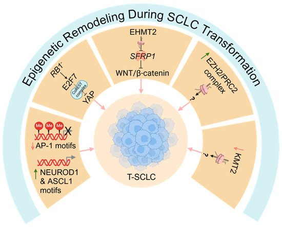 The above findings are consistent with, although slightly distinct from, a recent study that performed thorough epigenomic profiling of SCLC, T-SCLC and LUAD PDXs by assessing DNA methylation, histone modifications (H3K27Ac, H3K27me3 and H3K4me3) and chromatin accessibility (ATAC-Seq) [98]. This work demonstrated high overlap between de novo and T-SCLC, with patterns that were distinct from LUAD [98], suggesting that T-SCLC undergoes epigenetic rewiring as it evolves from LUAD. Similar findings in the ACB/PARB xenograft model of NE transformation demonstrated widespread changes in chromatin accessibility following NE transformation [50]. Furthermore, these NE-transformed xenografts showed hypo-accessibility of motifs associated with key NE transcription factors, such as ASCL1 and NEUROD1, and silencing of AP-1 motifs [50], consistent with the observations of Quintanal-Villalonga et al. [55]. Thus, several studies demonstrate that SCLC transformation is associated with significant epigenetic remodeling, particularly at key NE genes, which highlights a role for epigenetic regulators in SCLC transformation (Figure 4).