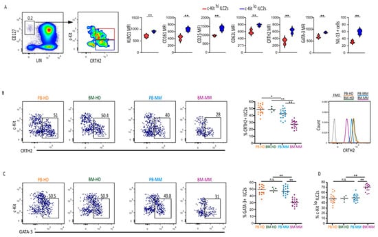 ILC2s have been classically identified as LIN neg CD127+ CRTH2+ cells showing heterogeneous expression of the surface marker c-Kit [18,19]. In humans, c-Kit is a useful marker, able to distinguish two functionally distinct populations of ILC2s [20]: c-Kitlo ILC2s are fully mature ILC2s as they are the most potent type 2 cytokine producers, while c-Kithi ILC2s show more plastic behavior, converting to an ILC3 and ILC1-like phenotype depending on the cytokine milieu of the microenvironment [19]. Supporting this evidence, the expression level of ILC2 common markers including KLRG1, CD161, CD25, CD62L, CRTH2, and the transcription factor GATA-3 was higher in the c-Kitlo subpopulation that responded with a higher production of IL-13 upon PMA/Ionomycin stimulation, as compared with that of c-Kithi ILC2s (Figure 1A). Although changes in ILC2s in human leukemia have been described [6], data related to modifications of ILC2s in MM pts are still lacking. To better define the distribution and the specific properties of ILC2 subsets during MM disease, we analyzed their features in the BM and PB of newly diagnosed, not treated, MM pts. We first determined the frequency of ILC2s in both PB and BM compartments and compared it with those in healthy donors (HD). We found a lower amount of ILC2s in PB, and this decrease was more pronounced in the BM of MM patients (Figure 1B). However, we observed a downregulation of the canonical marker CRTH2 in MM patients (Figure 1B), which commonly occurred upon activation and might have potential implications for detecting ILC2s. To overcome this issue, we instead used the GATA-3 marker to assess ILC2 quantification, confirming the reduction in these cells in the BM but not in the PB of MM patients (Figure 1C) and highlighting that CRTH2 fails in identifying ILC2s in this context. Concerning subset distribution, while, on average, c-Kithi ILC2 dominated (50% to 60%) when compared to c-Kitlo cells (40% to 50%) in the blood of healthy donors (HDs) [20], this ratio changed in MM patients, where the percentage of c-Kitlo increased significantly in the BM (65% to 75%) (Figure 1D and Figure S1B).