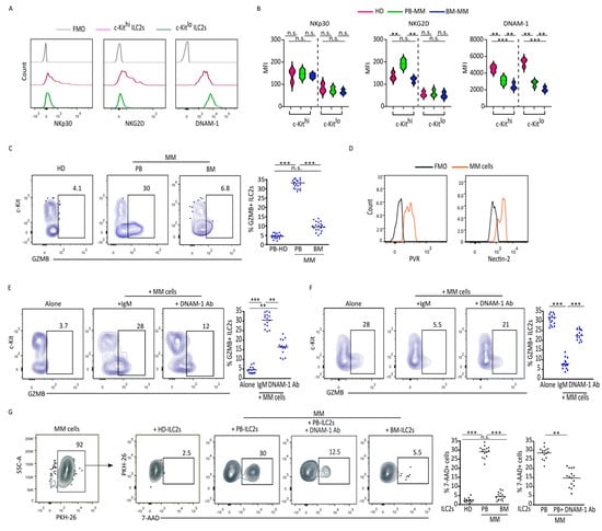 Figure 2. PB−ILC2s from MM pts express GZMB and lyse MM cells upon DNAM−1 engagement: (A) Representative histograms representing expression of NKp30, NKG2D and DNAM−1 on c−Kithi and c−Kitlo ILC2s from PB−HDs. FMO staining was used as a negative control. (B) Violin plots represent the expression of NKp30, NKG2D and DNAM−1 on c−Kithi and c−Kitlo ILC2s from HDs and MM pts (PB and BM). ** p < 0.01; *** p < 0.001; n.s., not significant. (n = 20). (C) Intracellular expression of GZMB was assessed on ex vivo ILC2s from HDs and MM pts (PB and BM). Scatter plots represent frequency ±SEM of GZMB+ ILC2s. *** p < 0.001. n.s., not significant. (n = 20). (D) PVR and Nectin−2 expression assessed on MM cells from BM−MM. FMO staining was used as negative control. (E) Representative dot plots and relative statistical analysis of GZMB expression in ILC2s from PB−HDs following 3 days of culture with MM cells in presence of DNAM−1-blocking antibody or IgM isotype as control. Scatter plots represent frequency ± SEM of GZMB+ ILC2s. ** p < 0.01; *** p < 0.001. (n = 15). (F) Representative dot plots and relative statistical analysis of GZMB expression in ILC2s from PB−MM following 3 days of culture with autologous MM cells in presence or absence of DNAM−blocking mAb. Scatter plots represent frequency ± SEM of GZMB+ ILC2s. *** p < 0.001. (n = 15). (G) Percentage of MM dead cells identified by 7−AAD, following 48 h of co−culture with ILC2s isolated from HDs or MM pts (PB and BM). DNAM−1−blocking mAb was added into co-culture where indicated. Scatter plots represent frequency ±SEM of 7−AAD+ MM cells. ** p < 0.01; *** p < 0.001. n.s., not significant; (n = 15).