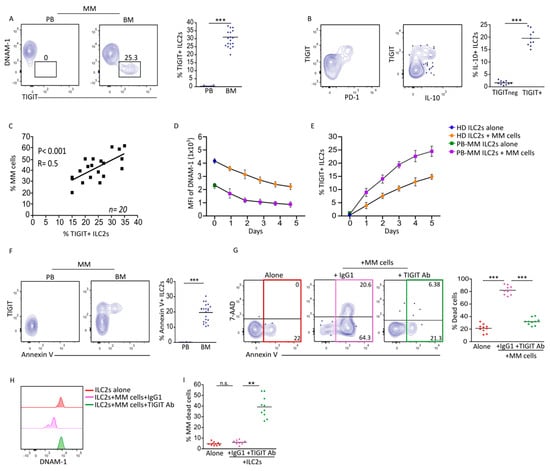 Figure 3. MM cells induce TIGIT−mediated ILC2 cell death: (A) Representative dot plots and relative statistical analysis showing expression of DNAM−1 and TIGIT on ILC2s from PB and BM of MM pts. Scatter plots indicate percentage ± SEM of TIGIT+ ILC2s. *** p < 0.001. (n = 20). (B) Flow cytometry analysis showing steady-state expression of PD−1 and IL−10 production following PMA/Ionomycin stimulation on BM−MM ILC2s. Scatter plots indicate percentage ± SEM of IL−10-producing ILC2s. *** p < 0.001. (n = 10). (C) Correlation between percentage of MM cells and TIGIT+ ILC2s in BM−MM (n = 20). *** p < 0.001; R = 0.5. (n = 20). (D) Graph represents daily expression of DNAM−1 on ILC2s from HDs and PB−MM pts following 5 days of culture with autologous MM cells. (n = 10). (E) Graph represents daily expression of TIGIT on ILC2s from HDs and PB−MM pts following 5 days of culture with autologous MM cells. (n = 10). (F) Representative dot plots and statistical analysis showing Annexin V expression on ILC2s from MM pts (PB and BM). Scatter plots indicate percentage ± SEM of Annexin V+ ILC2s from MM pts (PB and BM); *** p < 0.001. (n = 20). (G) Representative dot plots and relative statistical analysis showing expression of 7−AAD and Annexin V on ILC2s from BM−MM pts following 48 h of culture with primary MM cells in presence of TIGIT−blocking mAb or IgG1 kappa isotype as control. Scatter plots indicate percentage ± SEM of death cells (n = 10). *** p < 0.001. (H) Representative histogram showing expression of DNAM−1 on ILC2s from BM−MM pts following 48 h of culture with autologous MM cells in presence of TIGIT−blocking mAb or IgG1 kappa isotype as control. (I) Histograms showing MM cell viability following culture with ILC2s from BM−MM in presence or absence of TIGIT−blocking mAb or IgG1 kappa isotype as control. Scatter plots indicate percentage ± SEM of MM dead cells. ** p < 0.01. n.s., not significant; (n = 10).