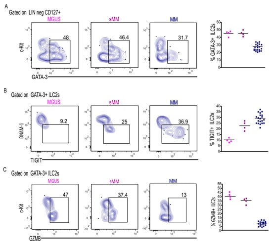Figure 4. Features of MM-ILC2s along disease progression: (A) Representative dot plots showing frequency of GATA−3+ ILC2s in BM of MGUS (n = 4), sMM (n = 4) and MM pts (n = 20). Scatter plot indicates percentage ± SEM of GATA-3+ ILC2s. (B) Representative dot plots showing expression of TIGIT on GATA−3+ ILC2s in BM during MM progression. Scatter plot represents percentage ±SEM of TIGIT+ ILC2s. (C) Intracellular expression of GZMB on GATA−3+ ILC2s in BM of MGUS (n = 4), sMM (n = 4) and MM pts (n = 20). Scatter plot indicates percentage of GZMB+ ILC2s. Scatter plots: MGUS-pink; sMM-violet; MM-blue.