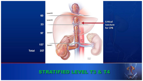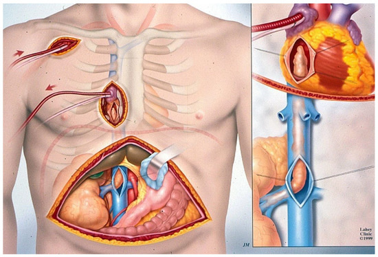 Management of tumor thrombi requires careful preoperative planning, and execution remains a technical challenge, usually requiring cardiopulmonary bypass (CPB) and deep hypothermic circulatory arrest (DHCA). Initially, in our institution, we had approached these level III and IV tumors by utilizing the median sternotomy approach [11,12,13,14,15], but currently, we favor the minimal access DHCA and CPB approach (Figure 2) [16,17]. A total of 70 of the 93 patients with level III and level IV thrombi have been treated with deep hypothermic cardiac arrest (DHCA) and cardiopulmonary bypass (CPB) [18].