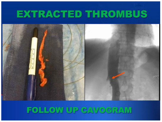 Extracted thrombus and postoperative cavogram. Arrow: remaining residual thrombus after endovascular downstaging.