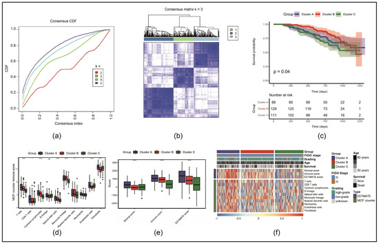 Identification of three necroptosis molecular clusters: (a) cumulative distribution function (CDF) curve of consistent clustering; (b) clustering results when the number of categories is three; (c) Kaplan–Meier (KM) survival curves; (d) comparison of Microenvironment Cell Populations (MCPs) counter immune scores (ns: p ≥ 0.05, * p < 0.05, ** p < 0.01, **** p < 0.0001); (e) comparison of Estimation of STromal and Immune cells in MAlignant Tumor tissues using Expression data (ESTIMATE), stromal and immune score; (f) clustering heatmaps of immune cell scores across different clinical features and groupings.
