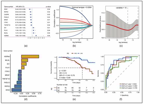 Construction of a multiple gene signature: (a) hazard ratio (HR) with the 95% confidence interval (CI) and the resulting p-value of the 11 prognosis-associated necroptosis genes identified with univariate Cox analysis; (b) change trajectories of each independent gene variable; (c) CIs in relation to each lambda; (d) correlation coefficients for each of the remaining ten genes; (e) KM survival curves for high-risk group (HRG) and low-risk group (LRG) regarding the risk score (RS) in the training set; (f) time-dependent receiver operating characteristic (ROC) curves in the training set and their resulting areas under the curve (AUC).