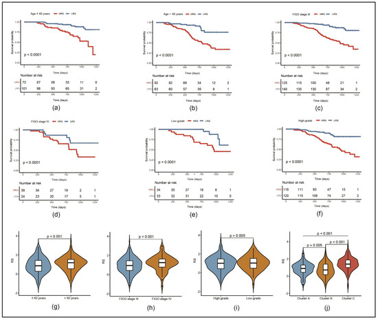 Analysis of clinical subgroup prognoses based on our RS in the GSE140082 dataset: (a–f) KM curves comparing HRG and LRG in different clinical subgroups regarding age, FIGO stage and grading; (g–j) comparison of RSs in contrasting subgroups regarding the same parameters and our molecular clusters A, B and C.