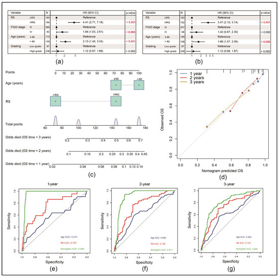 Proving the RS as an independent risk factor for the prognosis of EOC patients in the GSE140082 dataset: (a) univariate Cox analysis with significant p-values marked red; (b) multivariate Cox analysis with significant p-values marked red; (c) construction of a nomogram using significant variables from the multivariate Cox analysis; (d) calibration curve comparing the observed 1-, 2- and 3-year overall survival (OS) with the predicted OS from the nomogram; (e–g) ROC curves comparing the nomogram with the used single variables for the prediction of the 1-, 2- and 3-year OS.