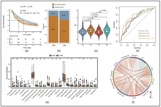 Response to programmed death ligand 1 (PD-L1) treatment regarding the RS in the immunotherapy cohort IMvigor210: (a) KM survival analysis comparing LRG and HRG; (b) comparing the proportion of immunotherapy responders (partial response (PR) and complete response (CR)) versus non-responders (progressive disease (PD) and stable disease (SD)) in both groups; (c) comparison of differences in RSs according to the efficacy of PD-L1 blockade, resulting in CR, PR, SD or PD; (d) ROC curves comparing the predictive accuracy of the RS, the tumor mutation burden (TMB), the neoantigen (NEO) or the combination of all three of them; (e) boxplots representing the infiltration levels of 22 types of immune cells comparing HRG and LRG (ns: p ≥ 0.05, * p < 0.05, ** p < 0.01, **** p < 0.0001); (f) correlation analysis of RS and different types of immune cells.