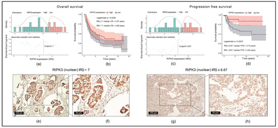 Immunohistochemical nuclear expression of RIPK3 in an EOC cohort and its correlation with OS and PFS: (a,c) optimal density gradient thresholds of RIPK3 expression calculated as immunoreactivity score (IRS); (b,d) KM analysis for OS and progression-free survival (PFS) high- and low-RIPK3-expression; (e–h) characteristic stainings of RIPK3 with different IRSs in two scales (100 µm and 50 µm).