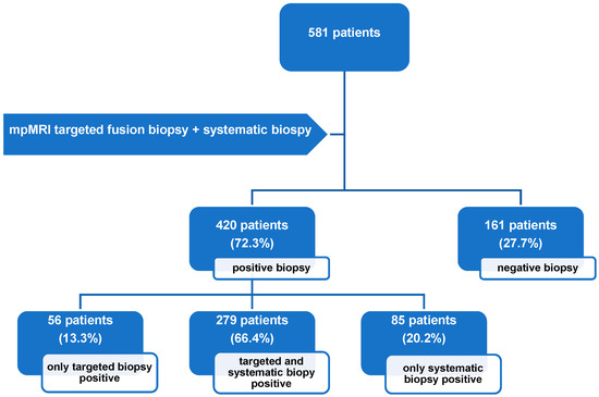 - Klotz, L.; Chin, J.; Black, P.C.; Finelli, A.; Anidjar, M.; Bladou, F.; Mercado, A.; Levental, M.; Ghai, S.; Chang, S.D.; et al. Comparison of Multiparametric Magnetic Resonance Imaging–Targeted Biopsy with Systematic Transrectal Ultrasonography Biopsy for Biopsy-Naive Men at Risk for Prostate Cancer: A Phase 3 Randomized Clinical Trial. JAMA Oncol. 2021, 7, 534–542. [Google Scholar] [CrossRef]