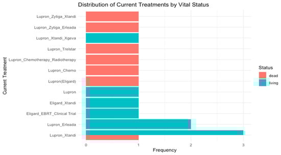 Seven (44%) patients underwent radical prostatectomy. The pharmacological treatment of these patients was complex and evolved throughout the treatment process, primarily due to resistance to specific drugs. Initial treatments included Eligard (Lupron, n = 9, 56%), external beam radiation therapy (EBRT, n = 4, 25%), abiraterone (Zytiga, n = 1, 6%), and finasteride (Proscar, n = 1, 6%). One patient (6%) was treated initially with brachytherapy. All four patients (25%) initially treated with EBRT were treated posteriorly pharmacologically with hormone inhibitors (ADT). Twelve patients (75%) were treated with enzalutamide (Xtandi) at some point in their history. One patient (6%) was also treated with chemotherapy docetaxel (Taxotere) and one with apalutamide (Earleada). Considering the first three treatments for all sixteen mCRPCa patients, the most frequent type was hormonal (n = 16, 100%), followed by radiotherapy (n = 9, 56%). Three patients (19%) did not have a third treatment. The three most frequent therapies used during these initial treatments were Eligard (Lupron, leuprorelin) (n = 16, 100%), followed by external beam radiotherapy (EBRT) (n = 6, 38%), and Xtandi (enzalutamide) (n = 6, 38%). As of the last visit, all patients were on Lupron (leuprorelin) treatment, and seven were on Xtandi.