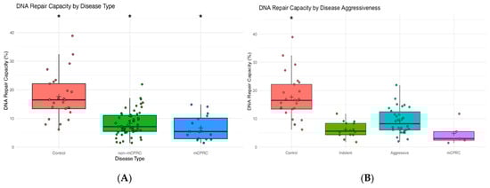 (A) Box plots representing the overall DNA repair capacity levels (%) in controls (n = 25), non-mCRPCa (n = 55), and mCRPCa patients (n = 16). (B) Overall DNA repair capacity levels (%) in controls and patients with indolent (n = 24) or aggressive (n = 31) prostate cancer. Symbols represent individual DRC values. The mean DRC value for each group is represented with a plus (+) sign. (*) sign denotes statistically significant differences between groups.