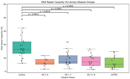 Overall DNA repair capacity in prostate cancer patients and controls. Sample distribution among study groups including controls and prostate cancer cases with tumors with GS 6, GS 7, GS ≤ 8, and mCRPCa. Statistical comparisons between controls and four GS groups and p-values are indicated by horizontal lines.