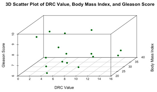 Figure 5 presents a 3D scatter plot of DRC values, BMI, and GS. The 3D scatter plot illustrates the relationship between these variables in 16 mCRPCa patients. DRC values range from approximately 2% to 17% without noticeable clustering in specific regions. No distinct linear trend is apparent between BMI and Gleason scores, suggesting a weak correlation. Patients with high BMIs (<40) exhibit GSs ranging widely from 7 to 10, implying that BMI alone is not a reliable predictor of PCa aggressiveness. Similarly, patients with high GSs (8–10) are distributed across the entire range of DRC values, indicating no clear association between DRC and tumor aggressiveness. Figure 6 also shows instances where individuals with very low DRC values present with either high or low GSs, highlighting that factors beyond DRC and BMI may be associated with tumor development and progression. Overall, the 3D scatter plot suggests that neither DRC nor BMI alone is closely related to GS, underscoring the complexity of PCa aggressiveness and the potential involvement of additional biological factors.