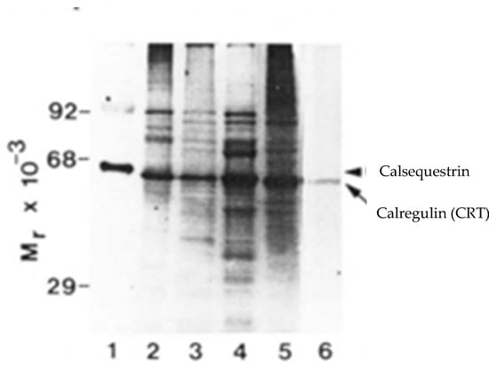 - Treves, S.; De Mattei, M.; Landfredi, M.; Villa, A.; Green, N.M.; MacLennan, D.H.; Meldolesi, J.; Pozzan, T. Calreticulin Is a Candidate for a Calsequestrin-like Function in Ca2(+)-Storage Compartments (Calciosomes) of Liver and Brain. Biochem. J. 1990, 271, 473–480. [Google Scholar] [CrossRef] [PubMed]