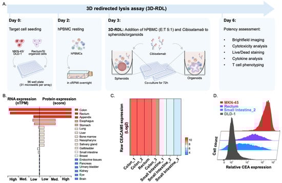 The experimental design of the 3D-RDL assay and CEA target expression validation: (A) In the preparation of the 3D-RDL assay, single cells from cell lines (MKN-45 and DLD-1) and organoids (Rectum and Small intestine_2) are seeded in 96-well microwell plates. At day 2, hPBMCs are rested overnight in cRPMI medium. At day 3, hPBMCs (E:T, 5:1) and Cibisatamab (six doses; 0.001–100 µM) are added to the aggregated spheroids and organoids and incubated for 72 h. (B) CEA protein and RNA expression levels in healthy human organs. CEA is expressed in a variety of epithelial tissues such as the urogenital, respiratory, and gastrointestinal tracts. In the healthy human colon, the CEA protein is restricted to the apical side of the differentiated epithelial cells forming the luminal surface. Source: Human Protein Atlas. (C) CEACAM5 bulk RNA expression levels in healthy colon, rectal, and intestinal organoids (Doppl SA Biobank). (D) Relative CEA protein expression levels of control cell lines MKN-45 (CEAhigh) and DLD-1 (CEAlow) and 2 different healthy organoid lines (Rectum and Small intestine_2) analyzed by flow cytometry.
