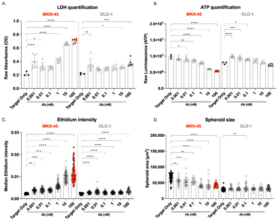 The direct comparison between MKN-45 and DLD-1 revealed that the cytotoxic effect of Cibisatamab on MKN-45 was significantly higher than on DLD-1, as demonstrated by ATP production, LDH release, and live/dead staining. Specifically, MKN-45 cells treated with 10 µM of Cibisatamab showed significantly greater cytotoxicity compared to all treatment doses applied to the DLD-1 cell line (Supplementary Table S1).