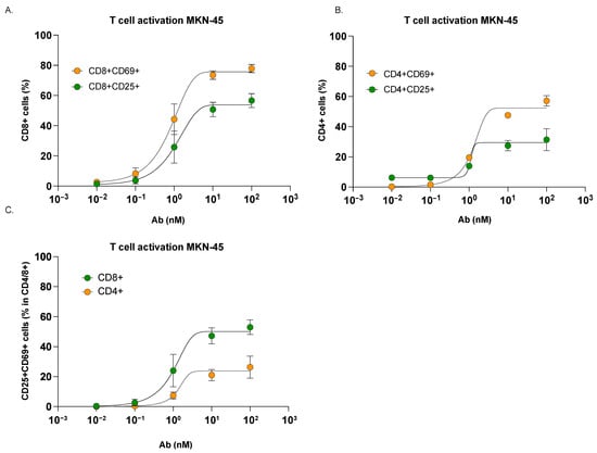 T cell activation after 72 h of co-culture of hPBMCs and MKN-45 cells in 3D-RDL assay format. (A) CD8+ and (B) CD4+ T cell response in the presence of healthy hPBMCs (E:T, 5:1), MKN-45 cells and increasing doses of CEA TCB antibodies. (C) CD8+ and CD4+ co-expression in the presence of healthy hPBMCs (E:T, 5:1), MKN-45 cells, and increasing doses of Cibisatamab. T cell activation upon Cibisatamab treatment was measured by flow cytometry while measuring the expression of CD25 (green) and CD69 (orange). Data represent non-linear regression analysis of the mean ± SD from 3 different hPBMCs donors tested in duplicate.
