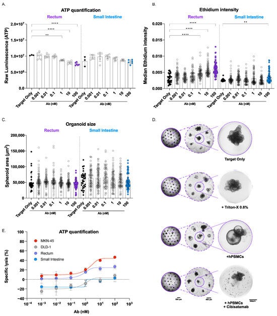 To directly compare the potency of the CEA TCB across the different cancer spheroids and healthy organoid lines, we analyzed the specific lysis after 72 h in the 3D-RDL assay, quantified by the ATP content, between the rectal and intestinal healthy organoids and the 3D cancer spheroids derived from MKN-45 and DLD-1. Cibisatamab selectively induced specific lysis in the CEAhigh-expressing MKN-45 cancer spheroids, as well as milder specific lysis in rectal organoids with intermediate CEA expression, while sparing the small intestinal organoids and the DLD-1 spheroids, both of which had low CEA levels (Figure 4E).