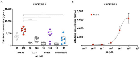 Next, we analyzed the release of Granzyme B in the supernatant collected from the 3D-RDL assay, which included the co-cultured hPBMCs together with MKN-45 and DLD-1 cancer spheroids, as well as healthy rectal and intestinal organoid lines, treated at two different doses (10 and 100 nM) of Cibisatamab for 72 h. Our results demonstrated a dose-dependent increase in Granzyme B levels across the tested models (Figure 5). At the higher dose (100 nM), hPBMCs co-cultured with MKN-45 spheroids and rectal organoids showed a pronounced increase in Granzyme B release compared to co-cultures with CEAlow DLD-1 spheroids and small intestinal organoids (Figure 5A). Granzyme B, a serine protease, played a pivotal role in inducing target cell apoptosis by facilitating cytotoxic T cell- and natural killer (NK) cell-mediated cytolytic activity [35]. The elevated Granzyme B release observed in the MKN-45 spheroids and rectal organoids aligned with the increased cell death induced by Cibisatamab in these models, highlighting a robust CEA TCB-mediated immune response. To further investigate this response, we examined Granzyme B release in the CEAhigh MKN-45 spheroid co-culture across a range of Cibisatamab doses (0.001–100 nM) (Figure 5B). The dose-dependent increase in Granzyme B secretion corresponded with the cytotoxic effects of Cibisatamab observed at the three highest concentrations (compare Figure 2A–D).