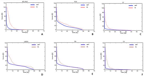 Dose–volume histogram (DVH) of aortic valve (A), right coronary artery (B), left ventricle (C), left anterior descending coronary artery (D), right atrium (E) and left circumflex artery (F) with proton (full line) and photon (dashed line) plans.