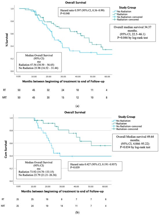 Overall Survival was higher in the RT group compared to the NRT group (p < 0.046) (Figure 1a). For the entire cohort of patients, the median survival time was 34.37 months (95% confidence interval [CI] 22.5–46.1), for the RT group it was 47.56 months (95% CI 38.5–56.65), and for the NRT it was 23.98 months (95% CI 16.52–31.44).