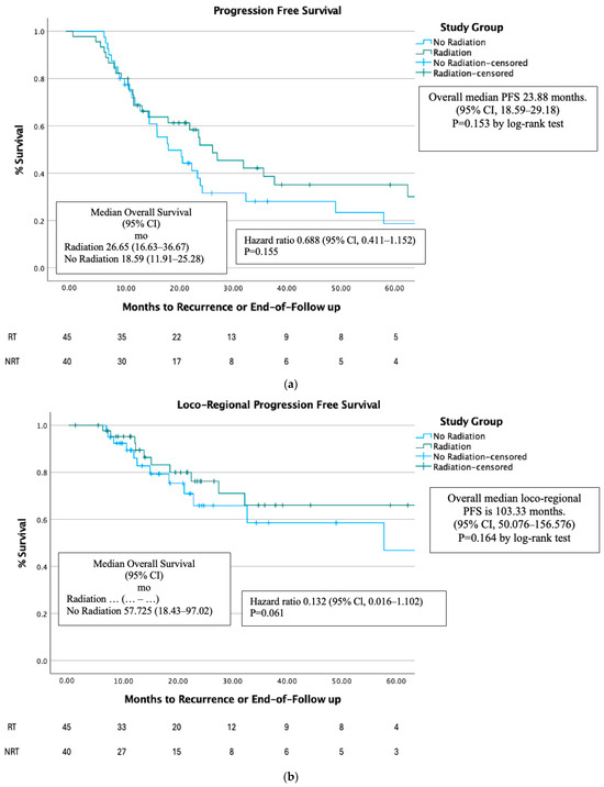 Progression-free survival (PFS) was not significantly longer in the radiotherapy (RT) group in the full cohort or after PSM. The RT group had a median PFS time of 26.65 months, while the NRT group had 23.98 months (p < 0.15). Loco-Regional PFS was higher in the RT group (p < 0.05). After PSM, the RT group showed a larger numerical benefit with a median PFS of 37.88 months compared to 18.60 months for the NRT group. Despite this trend, the difference did not reach statistical significance (p = 0.09). A larger cohort could confirm the trend we observed in our PSM analysis.