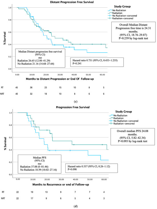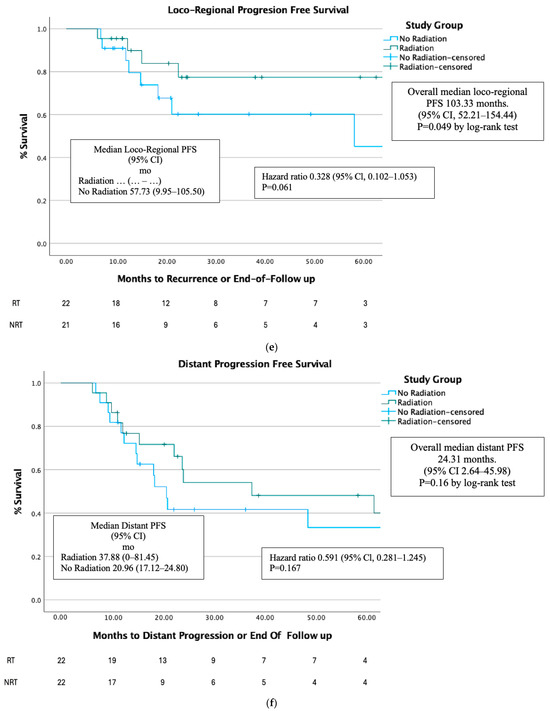There was no statistically significant difference in PFS (Figure 2d) and distant PFS (Figure 2f) between the RT group and NRT group, but after PSM, Loco-Regional PFS was higher in the RT group compared to the NRT group (p < 0.05) (Figure 2e).