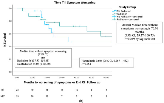 Time without symptom worsening was higher in the RT group compared to the NRT group (p < 0.02) (Figure 4a). For the entire cohort of patients, the median time without symptoms worsening was 37.22 months (95% CI 21.40–53.05), for the RT group it was 55.85 months (95% CI 28.67–93.03), and for the NRT group it was 27.00 months (95% CI 12.40–41.60).