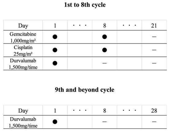 GCD chemotherapy was administered along with the Topaz-1 regimen. Intravenous administration was performed in a 21-day cycle for up to 8 cycles. Durvalumab (1500 mg) was administered on Day 1 of each cycle, in combination with gemcitabine (1000 mg/m2) and cisplatin (25 mg/m2), which were administered on Days 1 and 8 of each cycle. After completion of GC chemotherapy, 1500 mg of durvalumab monotherapy was administered once every 4 weeks until clinical or imaging (per RECIST v1.1) disease progression or unacceptable adverse events (AEs) took place (Figure 1) [5]. For patients with renal dysfunction or who had received cisplatin prior to GCD chemotherapy, the dose of cisplatin was reduced from the initial dose. Thereafter, the doses of gemcitabine and cisplatin were reduced according to the progress of the patients. During the period of GCD administration, blood tests for endocrinology, such as thyroid and adrenal functions, and blood tests for fibrosis markers, such as krebs von den lungen-6, were performed once a month for monitoring immune-mediated (im)-AEs. Patients with bile duct stenting for obstructive jaundice underwent endoscopic treatment and bile duct stent replacement at around three months.