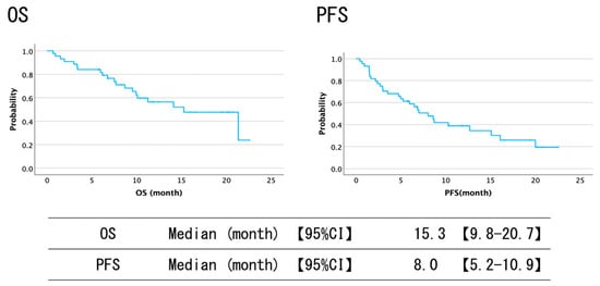 Survival curves of durvalumab plus gemcitabine and cisplatin chemotherapy. Survival curves of the overall results following durvalumab plus gemcitabine and cisplatin administration. The median overall survival (OS) was 15.3 months (95% confidence interval (CI): 9.8–20.7), and the median progression-free survival (PFS) was 8.0 months (95% CI: 5.2–10.9).