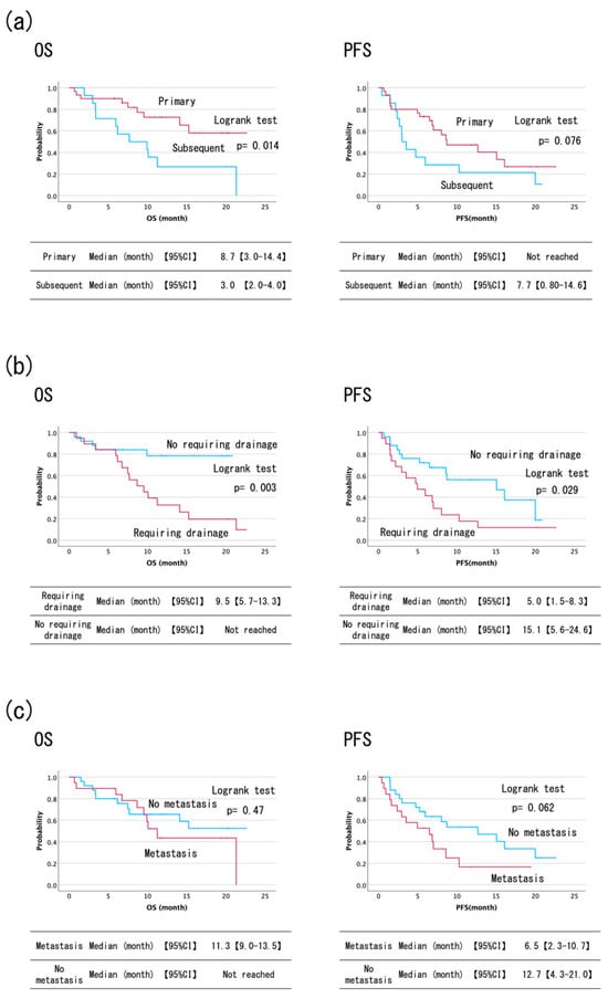 Subgroup analysis of the survival curves of durvalumab plus gemcitabine and cisplatin chemotherapy. (a) Survival curves of durvalumab plus gemcitabine and cisplatin according to primary chemotherapy. The probability of OS in the primary therapy group was greater than 0.5. The primary chemotherapy group exhibited a significantly longer OS than the second and subsequent chemotherapy groups (p = 0.014). For patients treated with primary chemotherapy, the median PFS was 8.7 months, whereas it was 3.0 months for those who received subsequent therapies (p = 0.076). (b) Survival curves of durvalumab plus gemcitabine and cisplatin by requirement for biliary drainage. The group requiring bile duct drainage demonstrated inferior OS compared to those who did not require drainage (p = 0.003). Additionally, the group requiring drainage had a significantly worse PFS (p = 0.029). (c) Survival curves of durvalumab plus gemcitabine and cisplatin according to metastasis status. When comparing locally advanced cases, postoperative recurrent cases, and metastatic cases, the probability of OS in non-metastatic cases was greater than 0.5, and there was no statistical difference observed (p = 0.47). Furthermore, there was no statistically significant difference in PFS among the locally advanced, postoperative recurrent, and metastatic cases (p = 0.062).