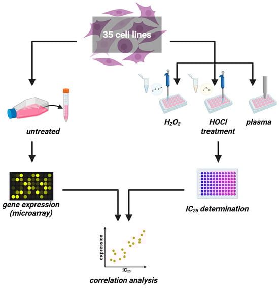Study protocol. (left) Thirty-five untreated cancer cell lines were cultured to harvest RNA for transcriptomic microarray analysis. (right) In parallel, the same cell lines were treated with increasing H2O2 or HOCl concentrations or increasing medical gas plasma treatment times for IC25 determination. Both datasets were correlated subsequently.