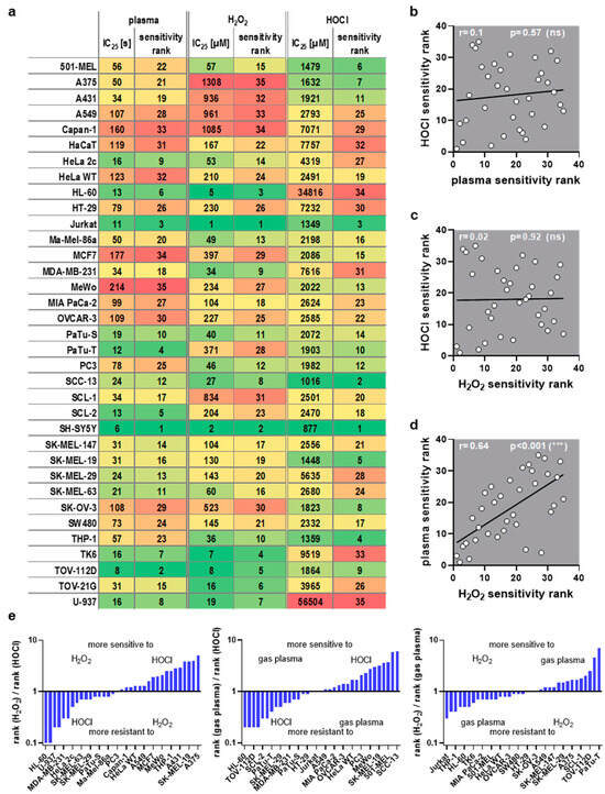 ROS sensitivity comparison. (a) IC25 values and assigned sensitivity ranks for medical gas plasma, H2O2, and HOCl, for cell lines being sorted alphabetically (each column has been color-coded for values only within each column from low values being green and high values being red); (b–d) Spearman correlation of (b) HOCl vs. plasma sensitivity, (c) HOCl vs. H2O2 sensitivity, and (d) plasma vs. H2O2 sensitivity showed a strong correlation between plasma and H2O2. (e) rank ratios of the three ROS treatments sorted from low to high for the three comparisons (for clarity, only every second cell line is labeled; missing entities can be retrieved from (a)).