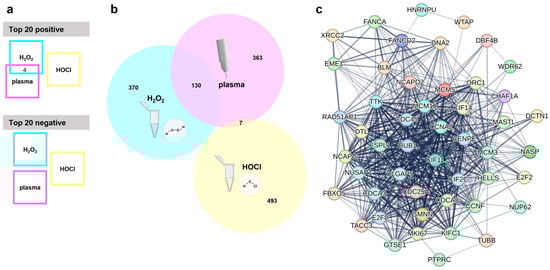 Transcriptomic analysis. (a) Visualization of overlapping genes in the top 20 genes with positive or negative correlation with medical gas plasma, H2O2, or HOCl sensitivity shows four shared genes in the top 20 positive and no common genes in the top 20 negatively correlating genes; (b) Venn diagram used to check for shared genes in the top 500 overall (positively and negatively) correlating genes from medical gas plasma; H2O2 or HOCl sensitivity correlations show wide overlap between medical gas plasma and H2O2 sensitivity; (c) STRING network of 39 cell cycle-related genes out of 130 shared genes from plasma and H2O2 overlap.