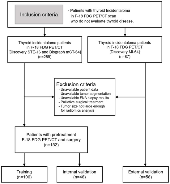 We retrospectively collected data from 289 consecutive patients with TIs who underwent F-18 FDG PET/CT between January 2010 and August 2014 at Keimyung University Dongsan Hospital. Patients who underwent an F-18 FDG PET/CT exam for staging or restaging purposes of various diseases, excluding those aimed at evaluating thyroid tumors, and who had performed FNA were enrolled in this study. The exclusion criteria were as follows: (1) unavailable patient data; (2) unavailable tumor segmentation; (3) unavailable FNA biopsy results; and (4) tumor size not large enough for radiomics analysis. A total of 152 patient cases were eligible in this study, and they were stratified and randomly divided into 7:3 training and internal validation sets. Both training and internal validation sets contained approximately the same malignant and benign ratio. An additional 58 patient cases obtained using different PET/CT scanners between April 2019 and April 2022 were used as an external validation set (Figure 1). All patient data were anonymized before analysis. FNA results were classified according to Bethesda categories, and histopathological outcomes post-thyroidectomy were recorded to confirm the final diagnosis. FNA-positive cases included Bethesda categories V and VI, while FNA-negative cases included categories I, II, III, and IV. The final diagnosis for malignant thyroid nodules was confirmed through histopathological examination after thyroidectomy in all patient cohorts, including the external validation group. Benign thyroid nodules were diagnosed based on FNA results for cases classified as Bethesda I–IV, with thyroidectomy performed in select cases. The present retrospective study was approved by the Institutional Review Boards of Keimyung University Dongsan Hospital, and the need for informed consent was waived.