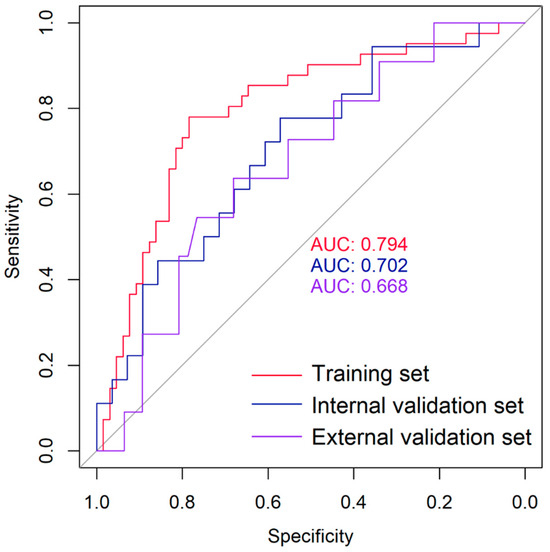 Receiver operating characteristic (ROC) curve of the radiomics score. The radiomics score showed good performance in the training set with an area under the curve (AUC) of 0.794, an AUC of 0.702 in the internal validation set, and an AUC of 0.668 in the external validation set.